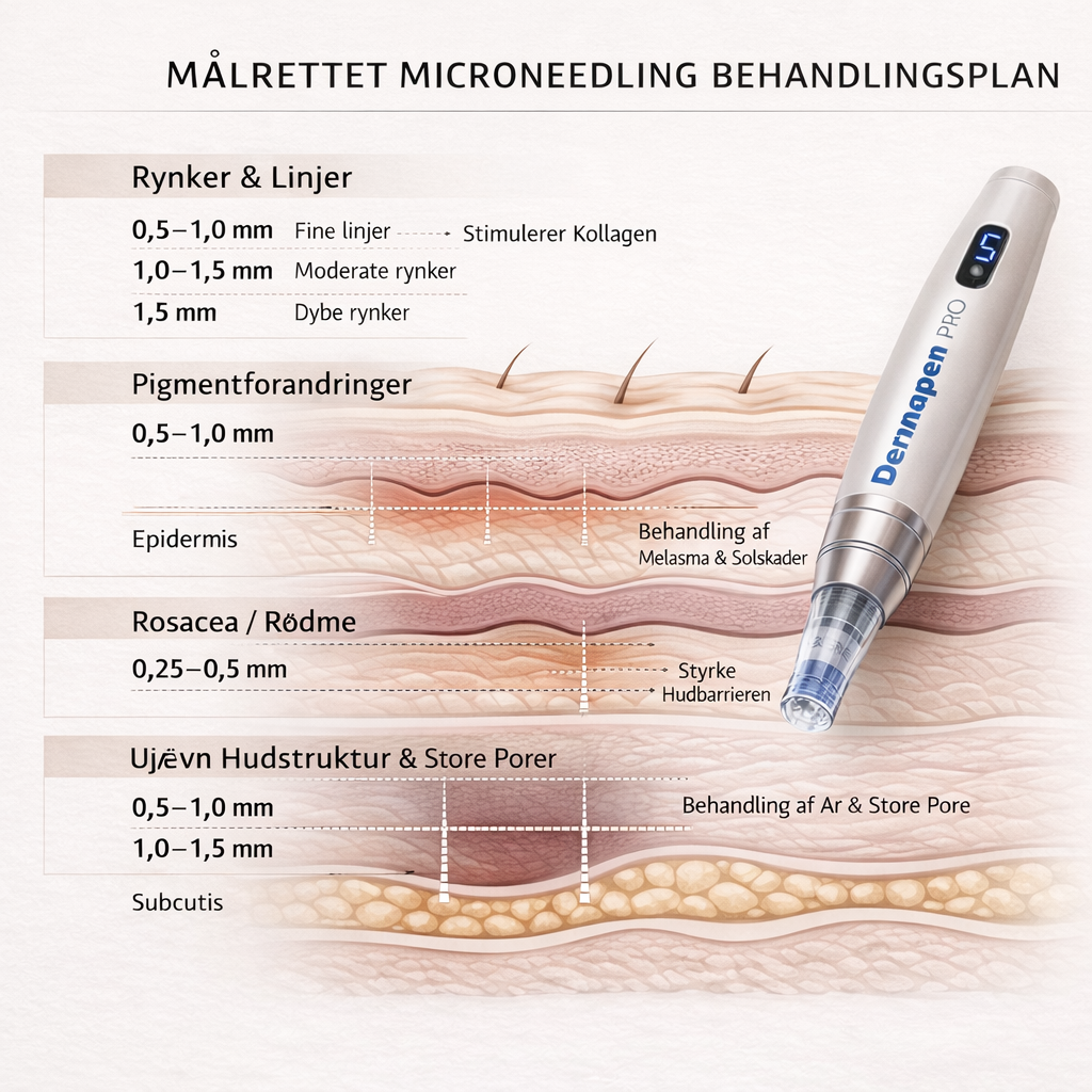0,5–1,0 mm – Pigment sidder primært i epidermis og den øverste dermis, så man behøver ikke så dyb behandling. Ofte kombineres med aktive sera (fx Retinol, C-vitamin).